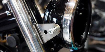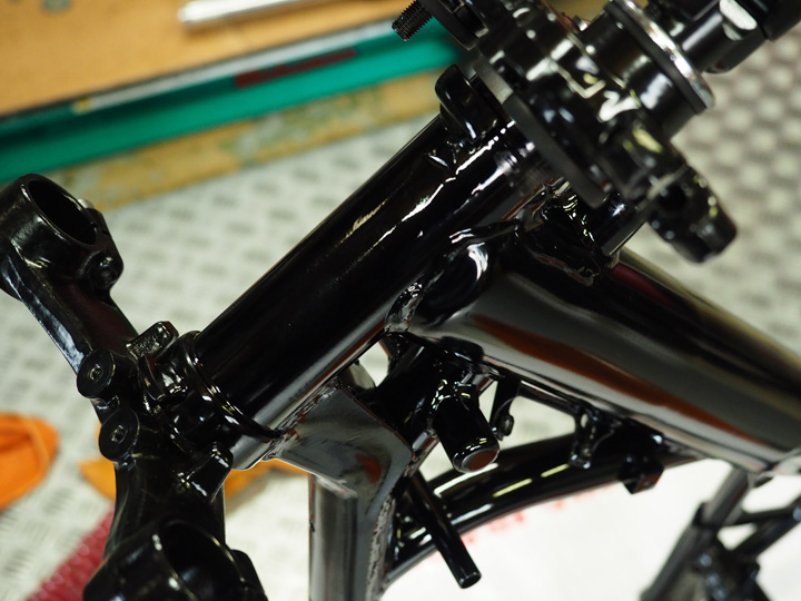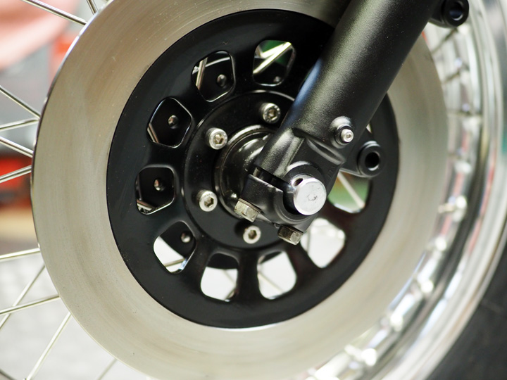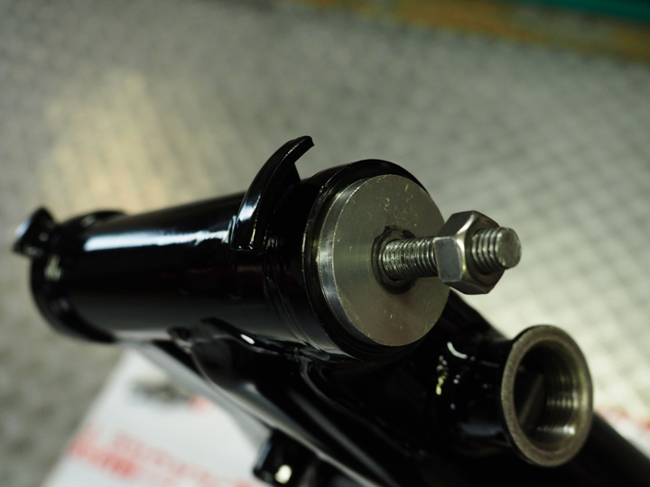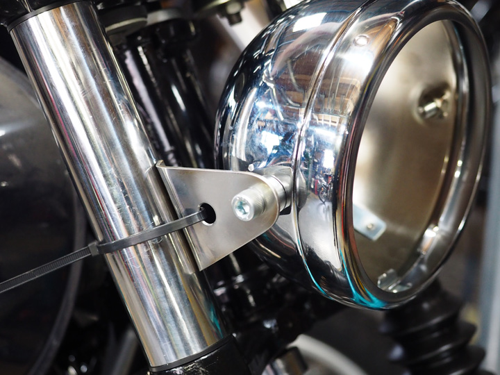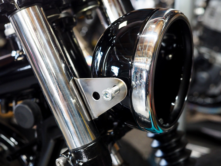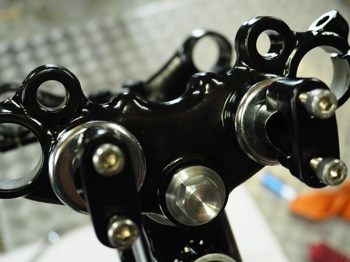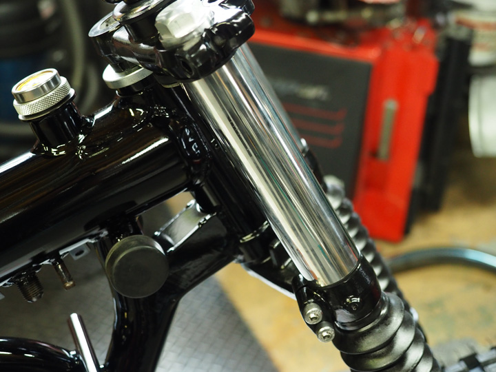 アップハンドルではフロントフォークに部品をクランプしないことはスッキリ綺麗にカスタムする上で重要な作業の一つになります。